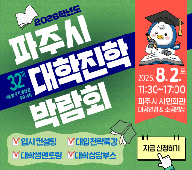 메인 본문 2 / 2 전체보기 교육복지 교육지원 교육환경 지역교육자원 새소식 2026년 지역교육자원 모집 안내 2025-10-15 2025 파주 진로교육박람회 2025-08-04 2025년 지역교육자원 역량강화 교육 실시 안내 2025-07-25 「2025 파주 통통 교육공동체 역량강화 연수」 개최 2025-06-16 「2026학년도 대입 수시전략 설명회」 개최 안내 2025-05-21 더보기 지역교육자원 등록된 내용이 없습니다. 더보기 배너전체보기 닫기