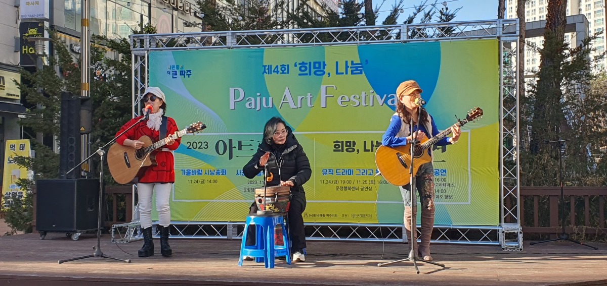 주요뉴스 인쇄하기 인쇄하기 파주시, 13~16일 「제5회 '희망, 나눔' 파주 아트페스티벌」 개최 - 축제 수익금, 어려운 이웃 위해 사용 예정 - 작성일 : 2024.11.12 조회수 : 577 첨부된 파일이 없습니다. 파주시, 13~16일 「제5회 '희망, 나눔' 파주 아트페스티벌」 개최축제 수익금, 어려운 이웃 위해 사용 예정 파주시가 주최하고 (사)한국예총 파주지회에서 주관하는 「2024 제5회 ‘희망, 나눔’ 파주 아트페스티벌」이 오는 13일부터 16일까지 운정행복센터에서 개최된다. 2016년 처음 시작되어 올해로 5회째를 맞이한 이 축제는 예술을 매개로 온정을 나누며 희망과 행복을 전하기 위해 마련된 행사로, 축제를 통해 발생한 수익금은 소외된 이웃을 위해 사용해 왔다. 행사 일정을 살펴보면, ▲13~16일에는 파주예총 전문예술인들의 미술, 사진, 시화 작품을 전시 및 판매하는 공간이 운영되며 ▲15~16일에는 ‘놀부전’을 비보이와 결합해 재탄생시킨 연극 ‘아이고 배야’가 운영된다. 또한, ▲16일에는 마임, 통기타 연주 등의 공연이, ▲15~16일에는 사진 촬영 행사가 진행될 예정이다. 우은정 문화예술과장은 “축제 수익금은 어려운 환경에서 생활하는 이웃에게 ‘나눔’을 전하는 데 사용할 계획”이라며, “일상 속에서 예술을 가까이 만날 수 있는 이번 축제에 시민 여러분의 많은 관심과 참여를 바란다”라고 말했다. 자세한 사항은 문화예술과 예술진흥팀(☎031-940-8522) 또는 파주예총 사무국(031-944-3396)으로 문의하면 된다. 다음글 파주시 “65세 이상 어르신 독감·코로나19 예방접종 꼭 받으세요” 이전글 시민중심, 내 일(JOB)을 만나다…파주시, 10월 24일 '더 큰 일자리박람회' 개최 태그 등록된 태그가 없습니다. 목록