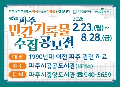 파주시 중앙도서관은 시민의 삶 속에 남아 있는 기록을 통해 지역의 역사를 되살리고자 2월 23일부터 8월 28일까지 ‘제5회 파주 민간기록물 수집 공모전’을 개최한다.