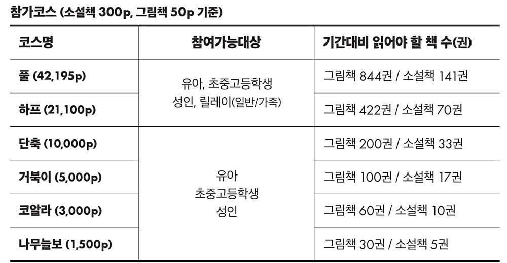 코스 신청은 자신의 목표 독서량에 따라 나무늘보코스(1,500p/그림책 30권/소설책 5권)부터 코알라코스(3,000p/그림책 60권/소설책 10권), 거북이코스(5,000p/그림책 100권/소설책 17권), 단축코스(10,000p/그림책 200권/소설책 33권), 하프코스(21,100p/그림책 422권/소설책 70권) 풀코스(42,195p/그림책 844권/소설책 141권)까지 6개 코스 중 하나를 선택하면 된다.