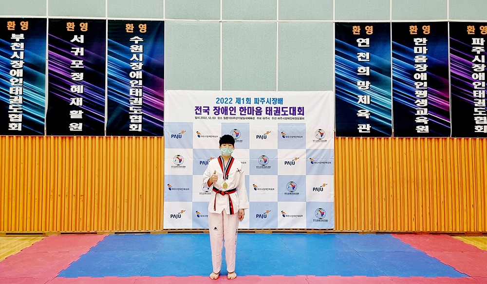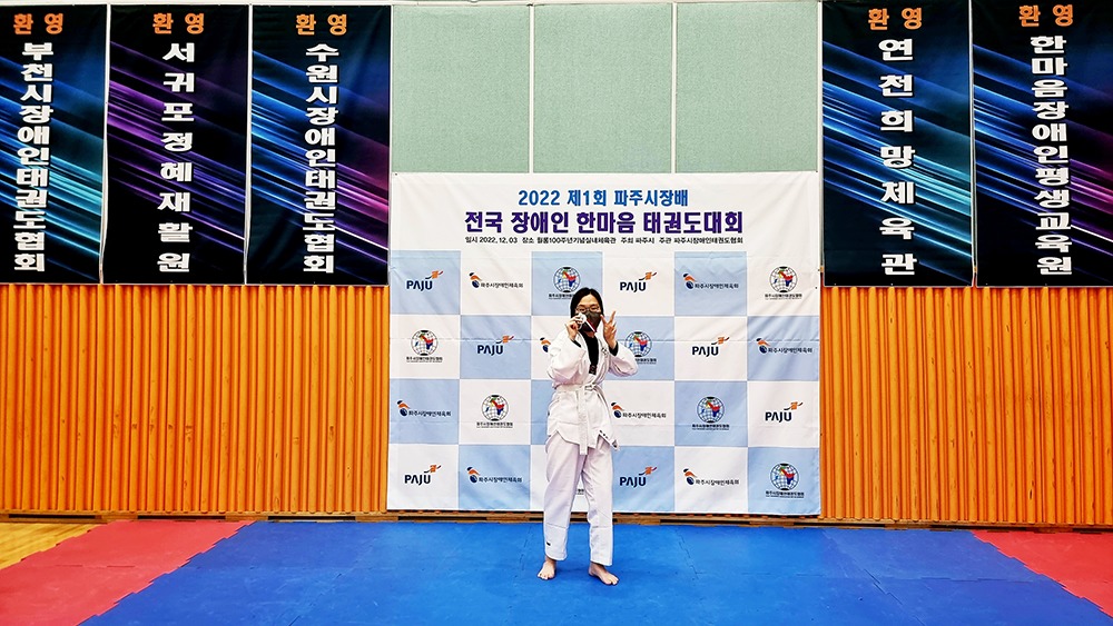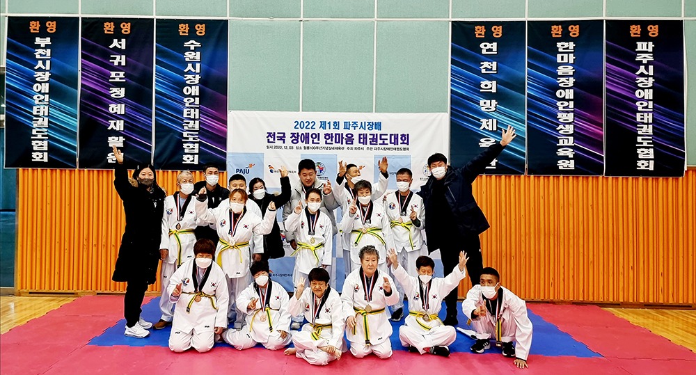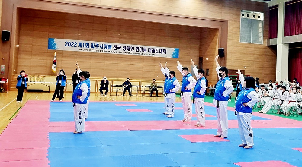 이역 멀리 도하에서 한국축구가 세계 강호 포르투갈을 극적으로 물리치고 당당히 16강을 돌파하던 그날, 늦잠을 쫓아내고 바삐 월롱 100주년 기념 체육관을 찾았다. 벌써 체육관 안에는 전국 각지에서 모인 선수단과 응원단의 굳은 결기와 우승에 대한 열망이 가득 채워져 있었다. 본부석 벽면 위로 길게 붙인 현수막이 한눈에 들어온다. ‘2022, 제1회 파주시장배 전국 장애인 한마음 태권도대회'가 그것이다.