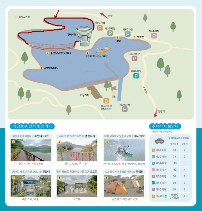 이러한 불편을 없애고 마장호수 전체를 순환하는 둘레길을 내기 위하여 파주시가 2020년 설계에 착수해 38억 원의 예산을 투입, 부식 방지에 강한 고강도 복합소재로 △수변산책로 204m △데크로드 418m를 수상에 설치해 순환형 산책로를 완성했다.