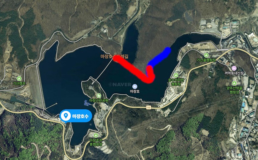 즉. 이번에 보완 완공된 구간은 아래 사진 속의 빨간색과 파란색 부분으로 출렁다리에서 마주 보이는 양주 쪽 방향이다.