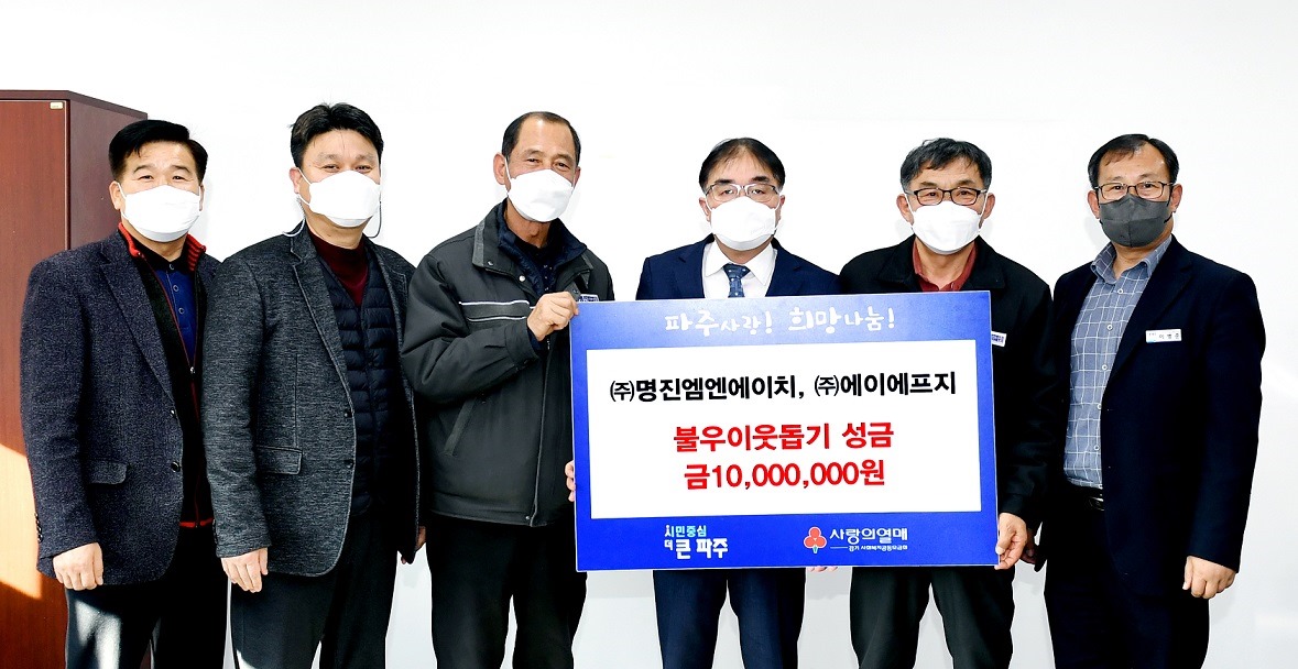파주시(시장 김경일)는 29일 관내 전문건설업체인 ㈜명진엠엔에이치(대표 한정열)에서 불우이웃돕기 성금 1,000만원을 기탁 받았다.