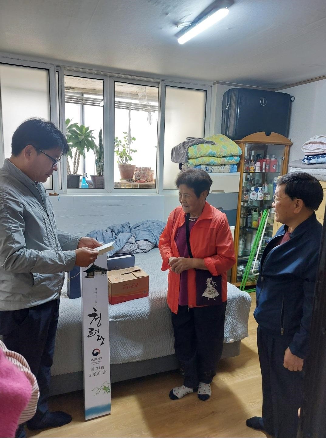 파주시 조리읍은 지난 11일 제27회 노인의 날을 기념해 100세를 맞은 관내 어르신의 가정에 방문해 ‘청려장(장수지팡이)’과 대통령 축하서한 및 실버경찰대에서 수확한 고구마 등 선물을 전달했다.