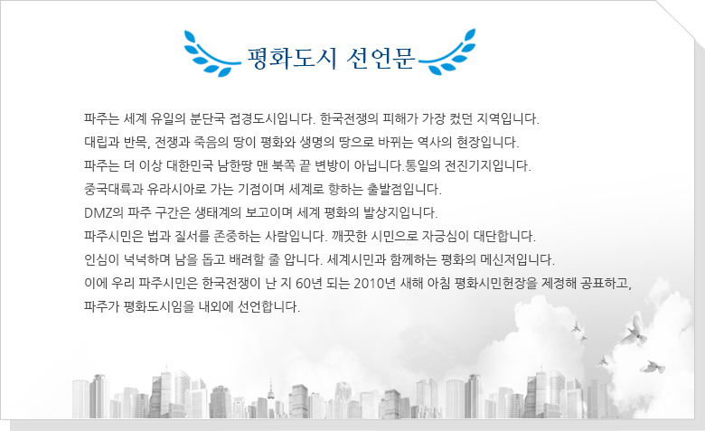 평화도시 선언문 - 파주는 세계 유일의 분단국 접경도시입니다. 한국전쟁의 피해가 가장 컸던 지역입니다. 대립과 반목, 전쟁과 죽음의 땅이 평화와 생명의 땅으로 바뀌는 역사의 현장입니다. 파주는 더 이상 대한민국 남한땅 맨 북쪽 끝 변방이 아닙니다. 통일의 전진기지입니다. 중국대륙과 유라시아로 가는 기점이며 세계로 향하는 출발점입니다. DMZ의 파주 구간은 생태계의 보고이며 세계평화의 발상지입니다. 파주시민은 법과 질서를 존중하는 사람입니다. 꺠끗한 시민으로 자긍심이 대단합니다. 인심이 넉넉하며 남을 돕고 배려할 줄 압니다. 세계시민과 함께하는 평화의 메신저입니다. 이에 우리 파주시민은 한국전쟁이 난 지 60년 되는 2010년 새해 아침 평화시민헌장을 제정해 공표하고, 파주가 평화도시임을 내외에 선언합니다.