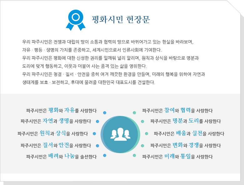 평화시민 헌장문 - 우리 파주시민은 전쟁과 대립의 땅이 소통과 협력의 땅으로 바뀌어가고 있는 현실을 바라보며, 자유·평등생명의 가치를 존중하고, 세계시민으로서 인류사회에 기여한다. 우리 파주시민은 평화에 대한 신성한 권리를 일깨워 널리 알리며, 원칙과 상식을 바탕으로 명분과 도리에 맞게 행동하고, 이웃과 더불어 사는 품격 있는 삶을 영위한다. 우리 파주시민은 청결·질서·안정을 중히 여겨 깨끗한 환경을 만들며, 미래의 행복을 위하여 자연과 생태계를 보호·보전하고, 후대에 물려줄 대한민국 대표도시를 건설한다. 1. 파주시민은 평화와 자유를 사랑한다. 2. 파주시민은 자연과 생명을 사랑한다 3. 파주시민은 워칙과 상식을 사랑한다. 4. 파주시민은 질서와 안전을 사랑한다. 5. 파주시민은 배려와 나눔을 솔선한다. 6. 파주시민은 참여와 협력을 사랑한다. 7. 파주시민은 명분과 도리를 사랑한다. 8. 파주시민은 배움과 실천을 사랑한다. 9. 파주시민은 변화와 경쟁을 사랑한다. 10. 파주시민은 변화와 경쟁을 사랑한다. 11. 파주시민은 미래와 통일을 사랑한다.