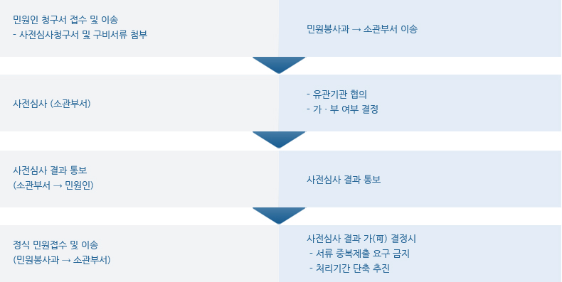 - 대규모 경제적 비용이 수반되는 민원사무에 대하여 정식으로 민원서류를 제출하기 전에 약식서류로 인허가 가능여부를 알아볼 수 있는 사전심사청구제를 시행하고 있으니 많은 이용있으시기 바랍니다.