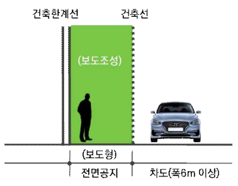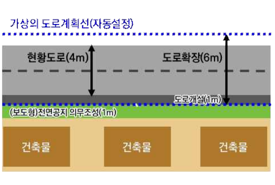 | 개발행위 시 도로계획선, 전면도로 및 구거 등의 경계와 건축물 사이를 1m이상 이격하여 전면공지 확보 | |