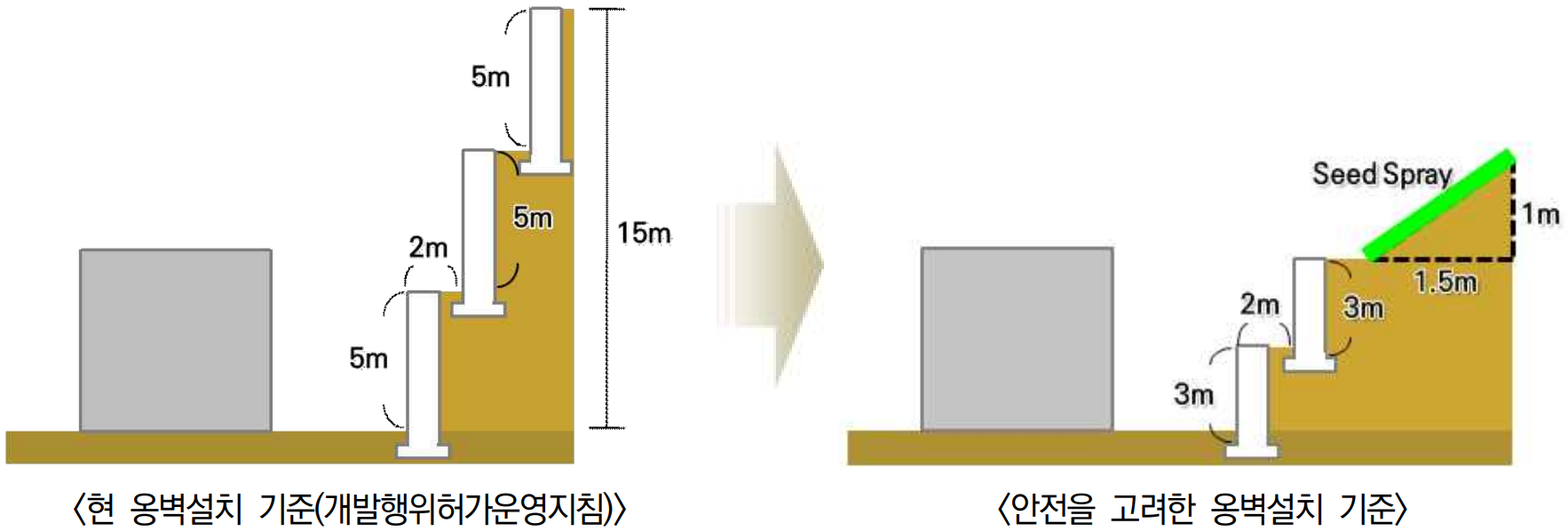 | 산지 개발 시 절토면 및 경관 영향 최소화 등 안정적인 개발을 위하여 옹벽설치 기준 강화 |
