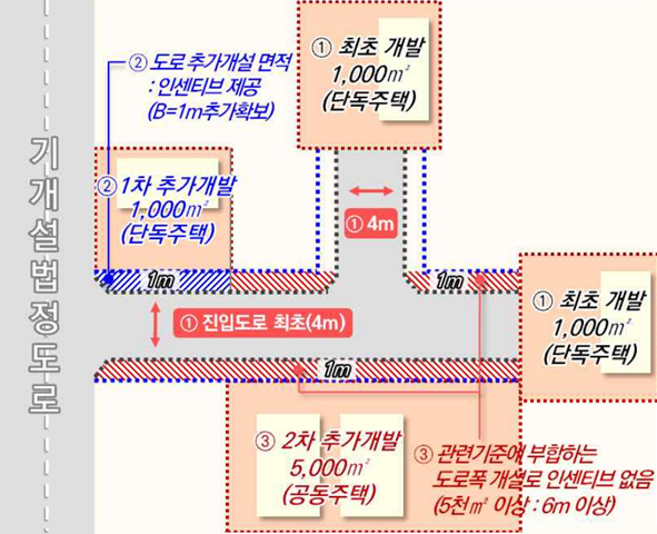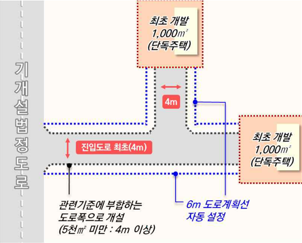 | <도로 미개설 부지 내 신규 개발행위 시> | <기 개설도로 이용 신규 개발행위 시> |