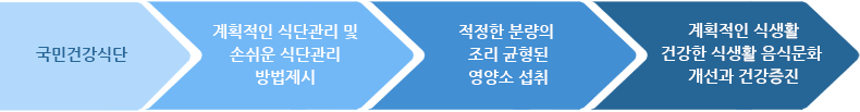 - 국민건강식단은 만성퇴행성 질환의 예방 및 치료에 중요한 영양관리를 위해 한국인 가정에 적합한 표준화된 식단을 제시하여 균형 잡힌 식생활을 권장하고 이것을 토대로 식생활 개선을 유도하기 위한 식단입니다.